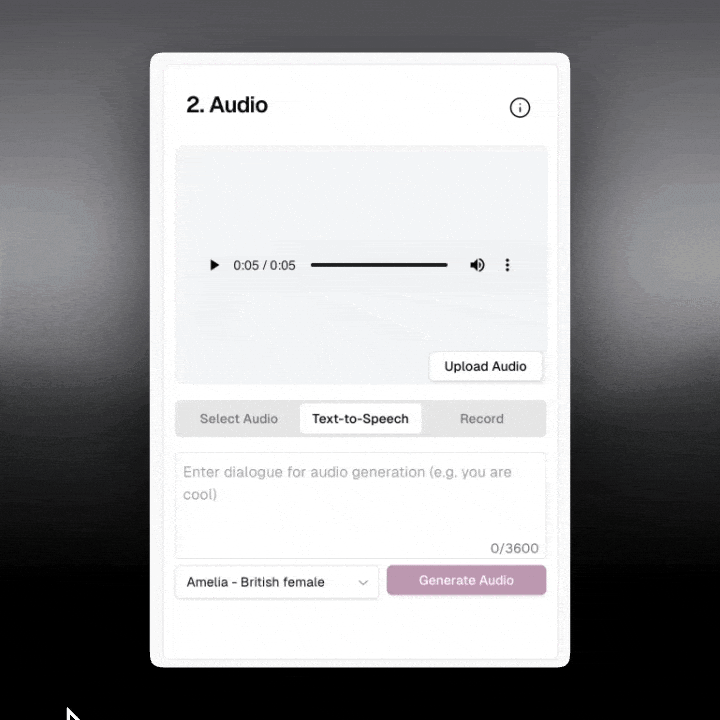 Next, we need to define the audio that we want our character to say. Similarly, there are a few options for the audio: