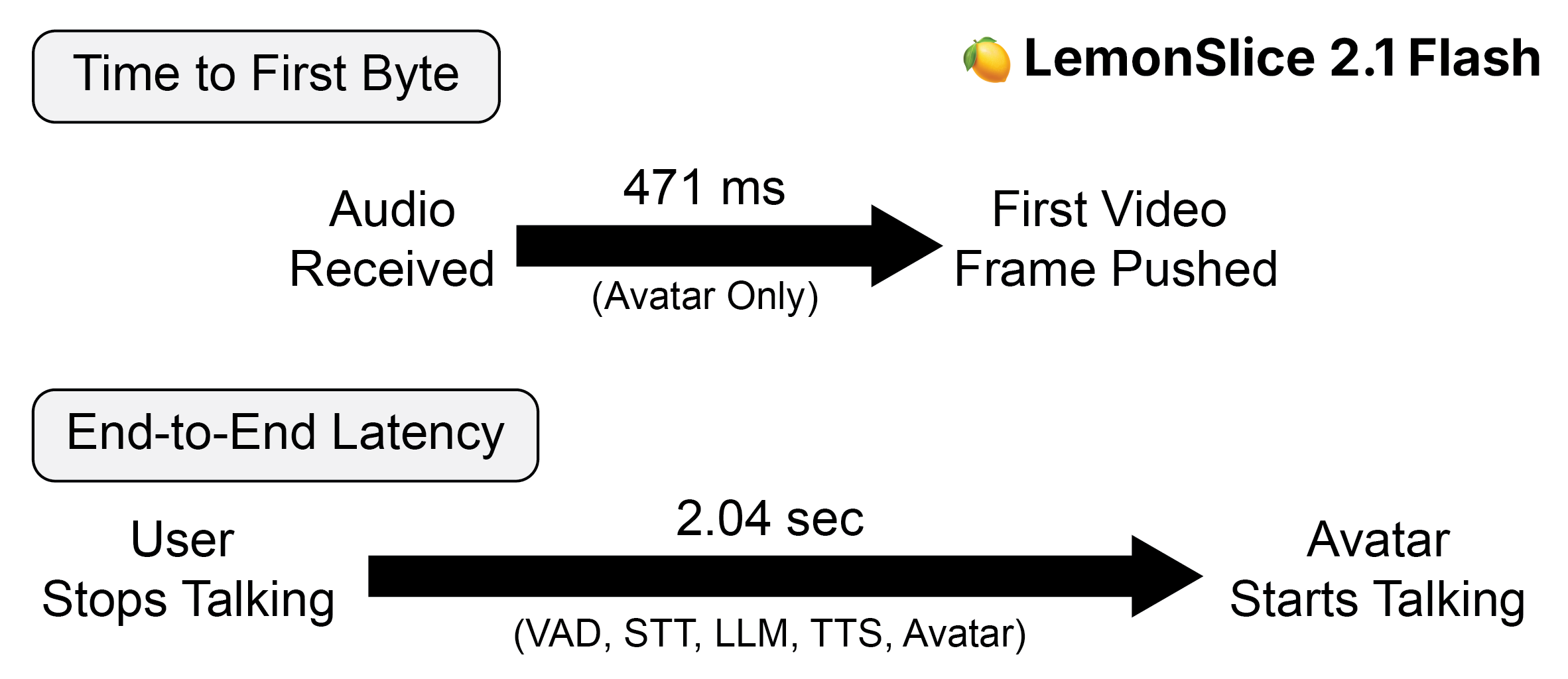 Today, we’re announcing LemonSlice 2.1 Flash, a video diffusion transformer model (DiT) and inference framework optimized for real-time, interactive avatars with state-of-the-art latency. Leveraging a novel model architecture and system-level optimizations, LemonSlice 2.1 Flash surpasses comparable avatar models in end-to-end latency benchmarks, while also offering key advantages as a one-stage DiT-based pipeline. We report an average time-to-first-byte of 471ms, measured from the time the first conditional audio chunk is received. When paired with third-party TTS, LLM, and STT components, LemonSlice 2.1 Flash achieves an average end-to-end response latency of 2.04s, enabling deployment in latency-sensitive applications.