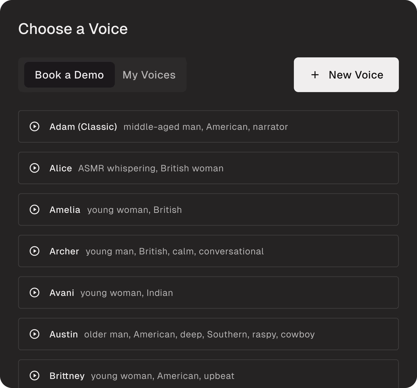 Select from an expressive library of AI voices across 100+ languages and accents, or design your own with a quick prompt like “Confident expert with a clear delivery.” Browse or create something unique—whether your short video needs a clear explainer, a compelling storyteller, or a captivating presenter.